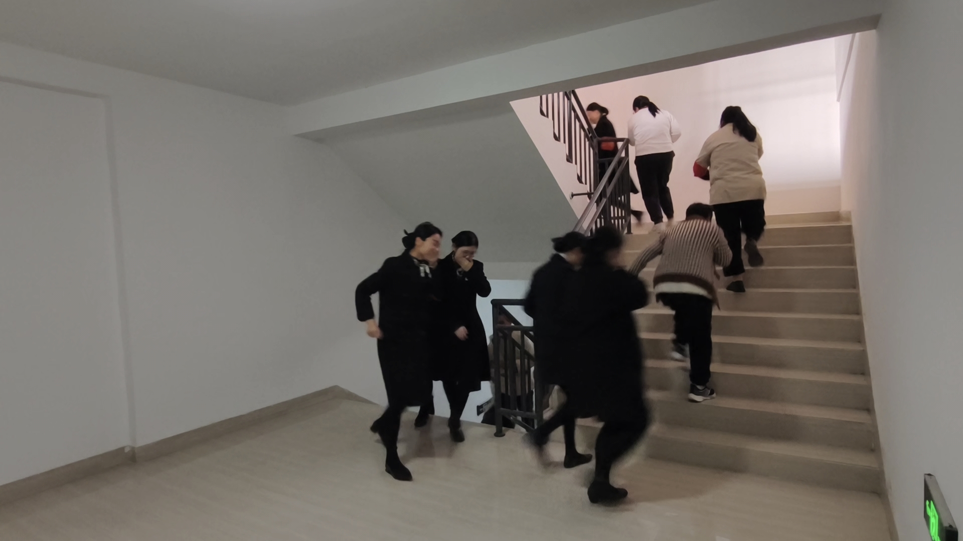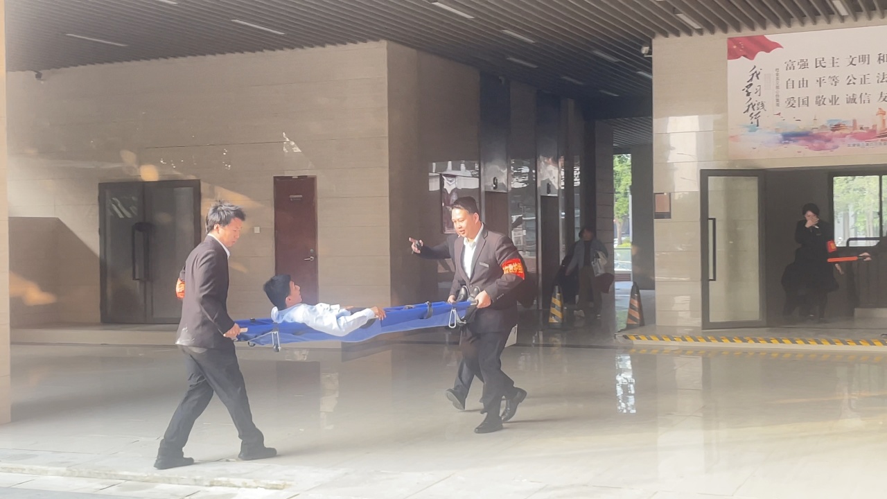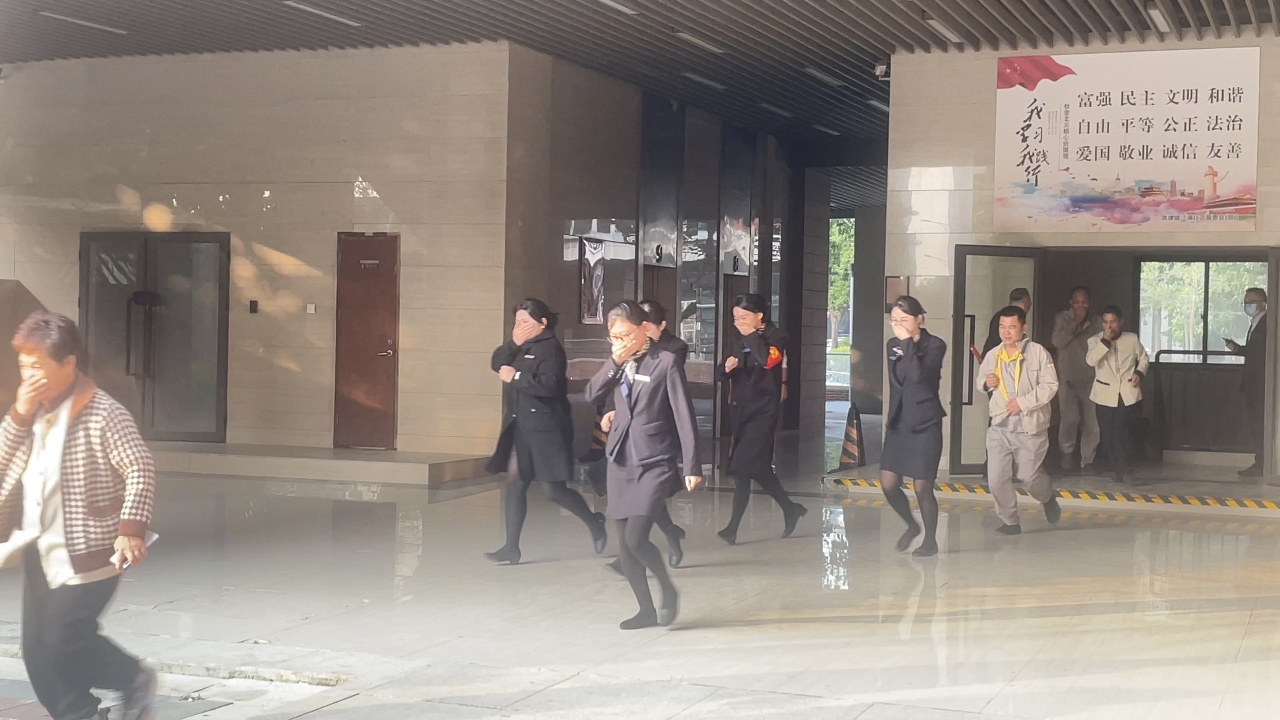 随着模拟火情警报响起,逃生演练正式启动。各楼层人员迅速反应,弯腰低姿、掩住口鼻,沿指定疏散路线有序撤离至安全区域,过程紧张而有序。
