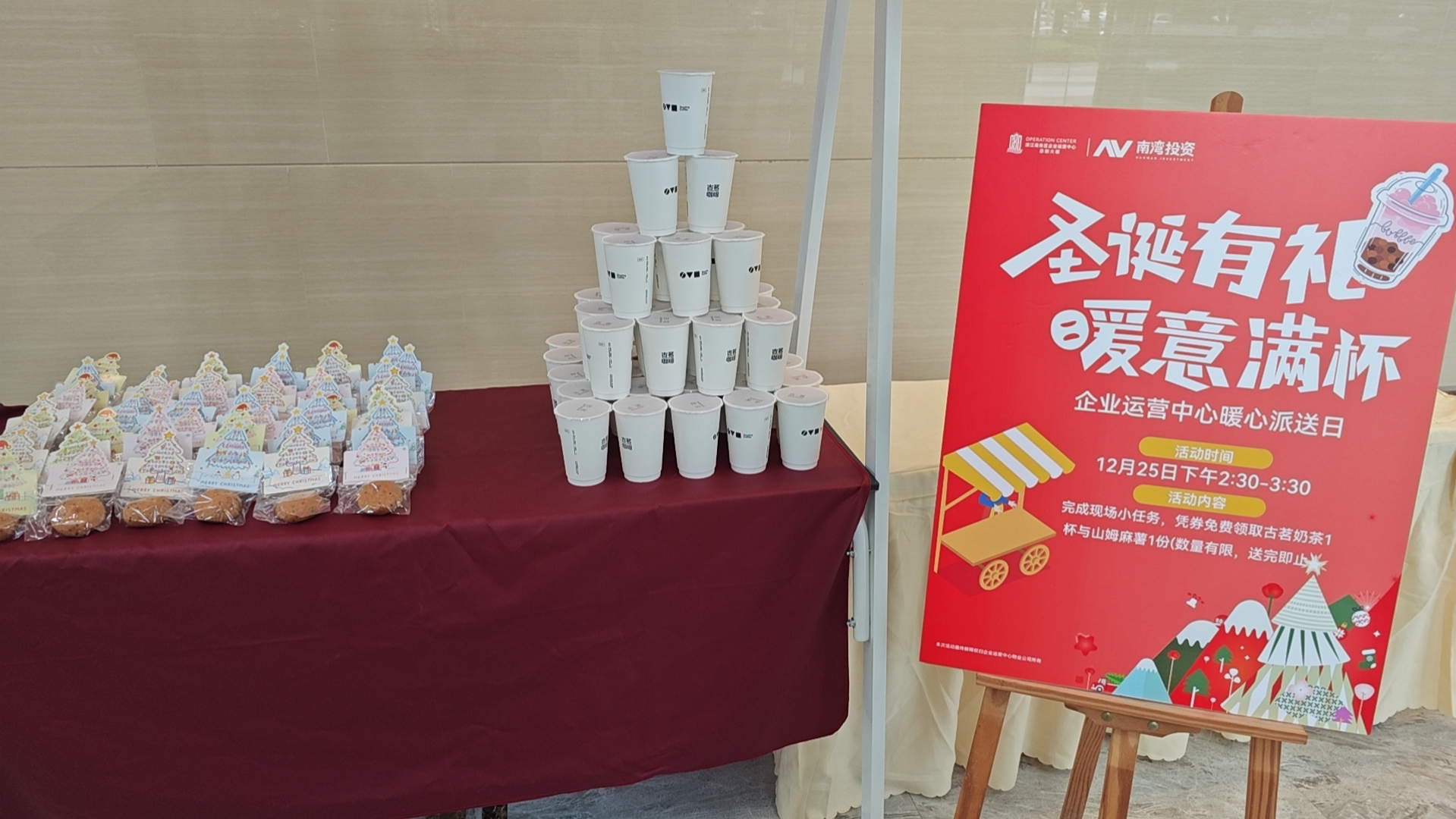 年末我们聚焦安全与关怀:开展冬季消防演练,巩固年度安全成果;组织急救知识技能培训,提升园区应急救护能力;更在圣诞时节进行“暖心派送”,以精心准备的奶茶/麻薯为您送去冬日温暖与节日祝福。同时,为迎接新年,我们装点了跨年氛围装饰,并于前台设立糖果饼干区(预计放置3天),持续为您的工作日常增添一份节日喜悦与甜蜜暖意。